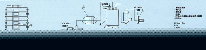 工作原理 湿物料自顶部加料口进入螺旋床内,在激振力及重力的作下,沿螺旋床自上而下作跳跃运动,直至最底层出料;同时,洁净的热风由螺旋床底部进入,与分布在床上的物料进行充分的传热和传质后,由顶部排湿口排出。从而使湿料达到了干燥的目的。