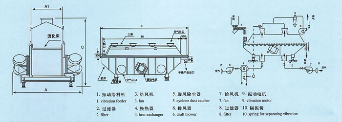 工作原理 物料自进料口进入机内,在振动作用下,物料沿水平流化床抛掷,向前连续运动,热风向上穿过流化床同湿物料换热后,湿空气经旋风分离器除尘后由排风口排出,干燥物料由排料口排出。