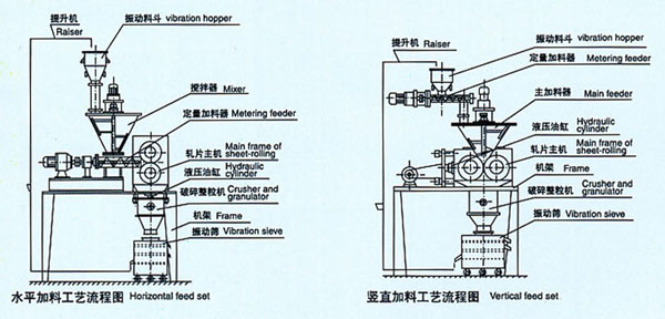粉状物料由振动料斗经定量送料器横向送至主加料器,在主加料器搅拌螺旋的作用下脱气并被预压推向两个左右设置的轧辊的弧形槽内,两个轧辊在一对相互啮合的齿轮传动下反向等速转动,粉料在通过轧辊的瞬间被轧成致密的料片,料片通过轧辊后在弹性作用下脱离轧辊落下,少量未脱离的料片被刮刀刮下,两个轧辊表面均布的条状槽防止粉料在被轧辊咬入时打滑。料片落入破碎整粒机整粒后进行振动筛过筛分级,得到符合要求的颗粒产品,筛下粗粉返回振动料斗循环制粒。