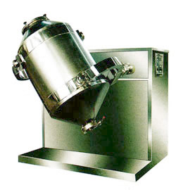 混合料桶,通过二只 Y 型万向节悬装于主、从动轴端部,二只万向节在空间既交叉又互相垂直。当主动轴被拖动旋转时,万向节使料桶在空间周而复始地作平移、转动和翻滚等复合运动。物料则在筒体内跟着作轴向、径向和环向的三维复合运动。筒内的多种物料相互流动、扩散、掺杂,最后呈均匀状态。