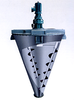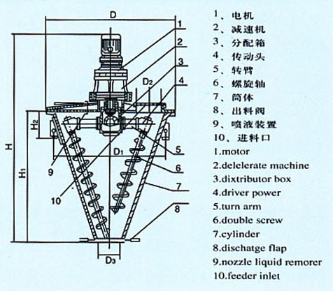 DSH 型混合机工作由顶端的电动机带动双级双出轴摆线针轮行星减速器,输出公转自转两种速度,经传动分配路、齿轮传动,两根螺旋轨作行星式的运转。