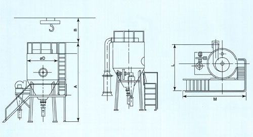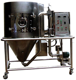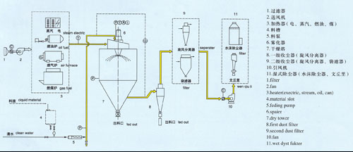 空气通过过滤器和加热器,进入干燥器顶部的空气分配器,热空气呈螺旋状均匀进入干燥器。料液由料液槽经过滤器由泵送至干燥器的离心雾化器,使料液喷成极小的雾状液滴,料液和热空气并流接触,水份迅速蒸发,在极短时间内干燥为粉末状成品。成品由干燥塔底部和旋风分离器排出,废气由风机排出。